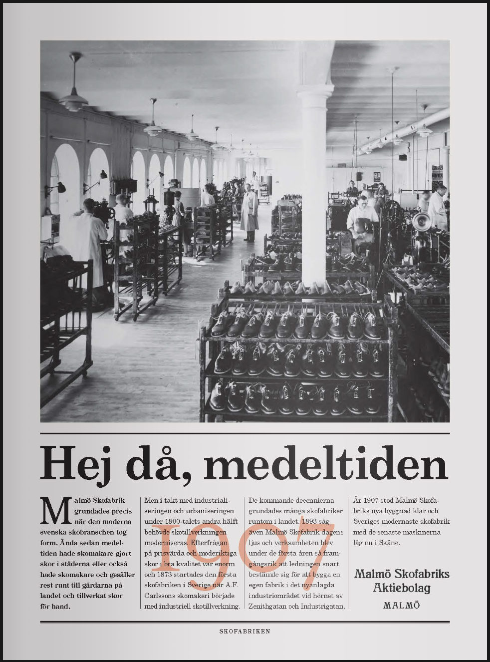 ”Malmö Skofabriks Aktie-Bolag”. Så står det stolt hugget i sten på fasaden till det som en gång var Malmös modernaste fabriksbyggnad. Malmö Skofabrik grundades 1893 och verksamheten gick så bra att bolaget redan i början av det nya seklet bestämde sig för att bygga en egen fabrik i det nyanlagda industriområdet mellan stadens utkant och landsbygdens åkrar.